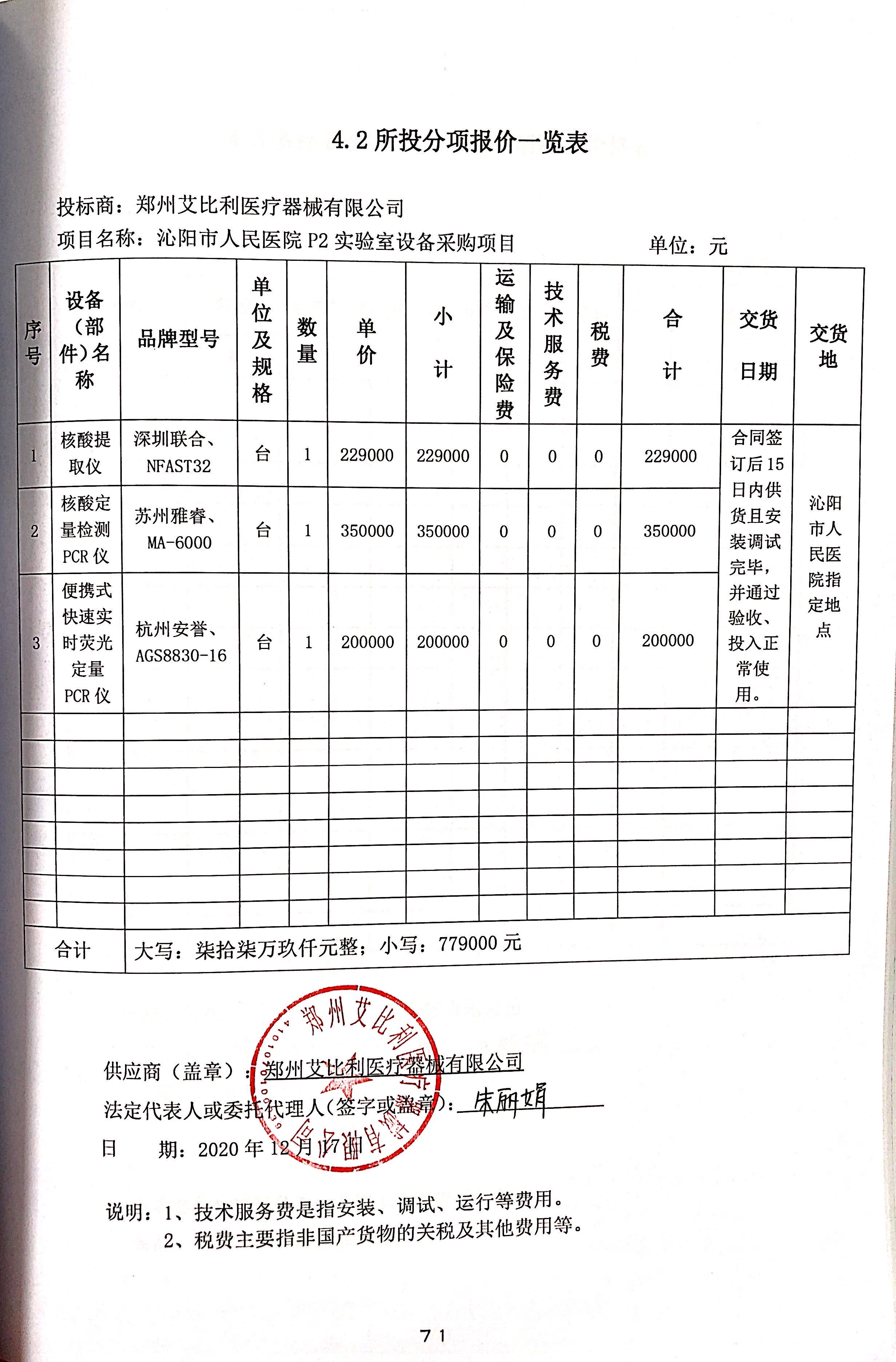 包2 | 核酸提取儀、核酸定量檢測PCR儀、便攜式快速實時熒光定量PCR儀 | 鄭州艾比利醫(yī)療器械有限公司 | 鄭州高新技術(shù)產(chǎn)業(yè)開發(fā)區(qū)蓮花街338號11號樓4層25號 | 779000.00 | 元 |