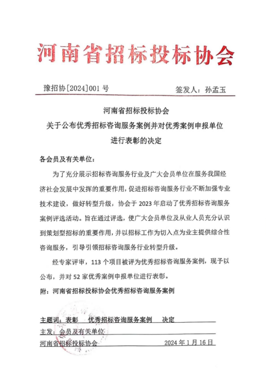 ?? ? 1 月 16 日,河南省招標投標協(xié)會公布了優(yōu)秀招標咨詢服務案例并對優(yōu)秀案例申報單位進行表彰。河南豫信招標有限責任公司申報的開封綜合報稅區(qū)建設項目全過程工程咨詢、鄭州中滎城市更新有限公司滎陽市 “ 鄭上文脈活力帶 ” 城市更新項目鄭上路道路改造提升及 15 分鐘生活圈工程、信陽市出山店供水工程項目 EPC 總承包、河南林州弓上抽水蓄能電站施工供水工程項目、河南省大數(shù)據(jù)管理局一體化協(xié)同辦公平臺項目,被評為優(yōu)秀招標咨詢服務案例。
