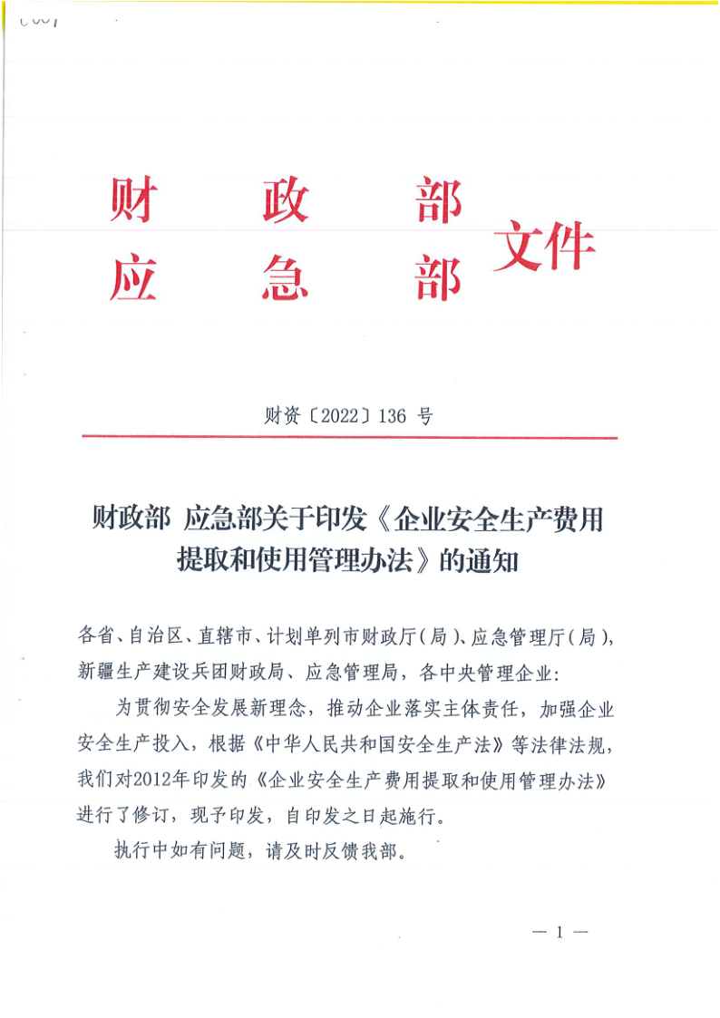 關(guān)于轉(zhuǎn)發(fā)財(cái)政部應(yīng)急部印發(fā)企業(yè)安全生產(chǎn)費(fèi)用提取和使用管理辦法的通知