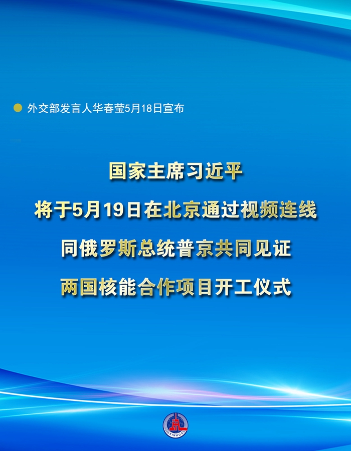 新華社北京5月18日電 外交部發(fā)言人華春瑩18日宣布:國家主席習(xí)近平將于5月19日在北京通過視頻連線,同俄羅斯總統(tǒng)普京共同見證兩國核能合作項(xiàng)目開工儀式。