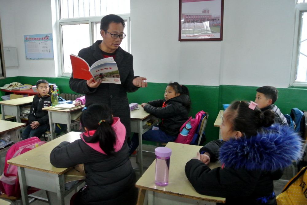 陜西省銅川市照金北梁紅軍小學(xué)副校長(zhǎng)陶建剛給孩子們講《紅色照金》(2018年12月4日攝)。新華社記者 梁愛平 攝