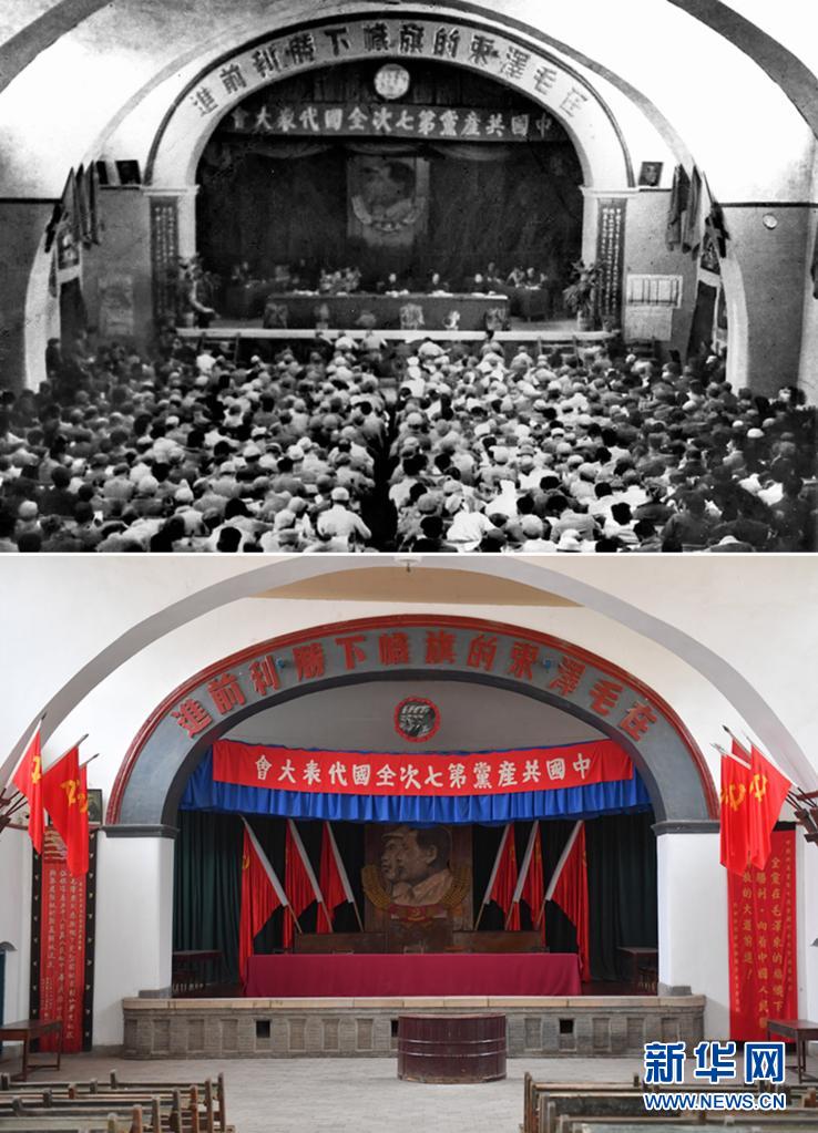 拼版照片:上圖為中國共產(chǎn)黨第七次全國代表大會(huì)會(huì)場(資料照片,新華社發(fā));下圖為2021年3月31日拍攝的位于延安市楊家?guī)X革命舊址的中國共產(chǎn)黨第七次全國代表大會(huì)會(huì)場(新華社記者張博文攝)。新華社發(fā)