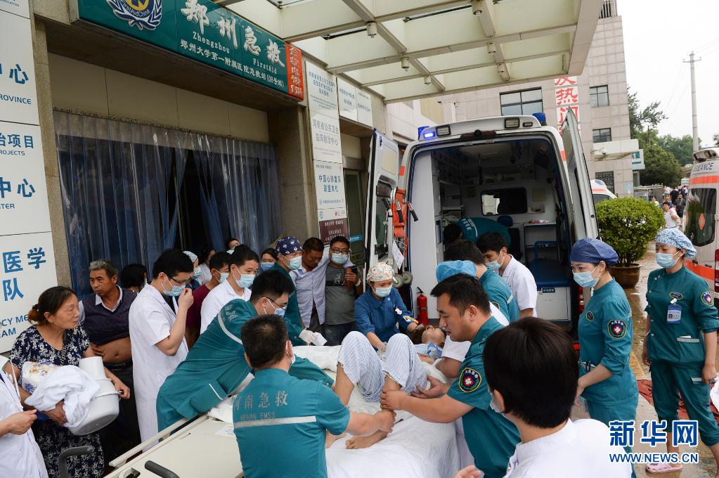7月21日,鄭州大學第一附屬醫(yī)院河醫(yī)院區(qū)醫(yī)護人員幫助患者轉院。新華社記者 趙鵬 攝