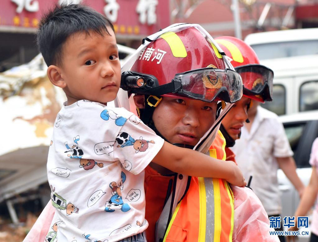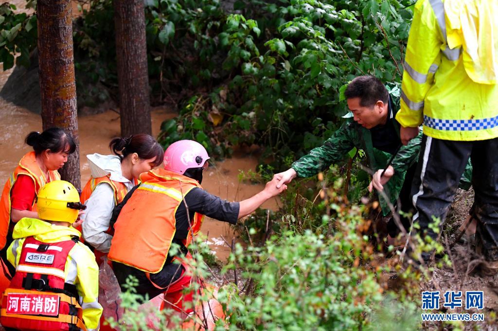 7月21日,在鞏義市米河鎮(zhèn),消防救援人員幫助群眾轉移。新華社記者 李嘉南 攝