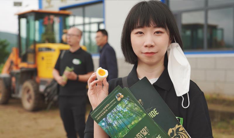 2020年8月,阿里鄉(xiāng)村品牌設計師蔣宇寧在吉林省汪清縣走訪調(diào)研松針雞養(yǎng)殖基地,手中拿著當?shù)氐乃舍橂u蛋。(受訪者供圖)