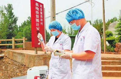 ?? 7月28日,汝陽縣疾控中心工作人員對(duì)劉店鎮(zhèn)邢坪村群眾飲用水進(jìn)行抽樣化驗(yàn)。 康紅軍 攝