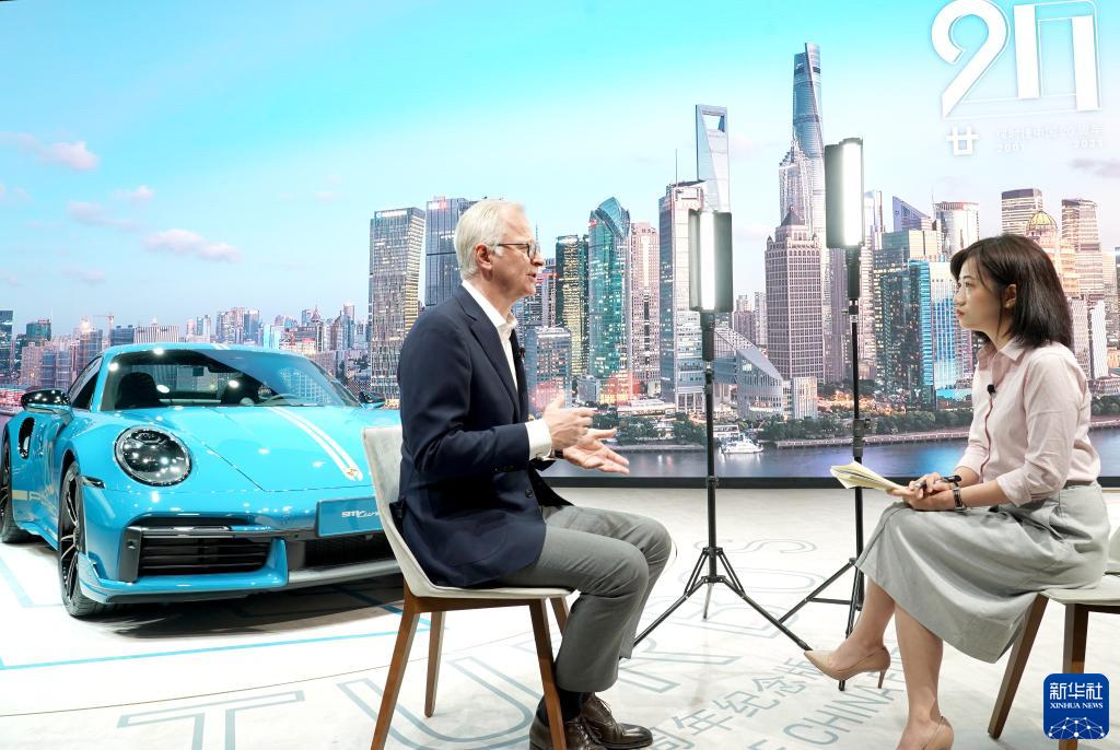 4月19日,保時捷高管在第十九屆上海國際汽車工業(yè)展覽會上接受采訪。新華社記者 陳建力 攝