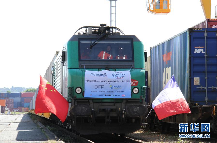 6月23日,滿載防疫物資的中歐班列抵達(dá)法國(guó)巴黎東南郊的瓦朗通,此次班列是中法首趟抗疫物資專列。新華社記者 徐永春 攝