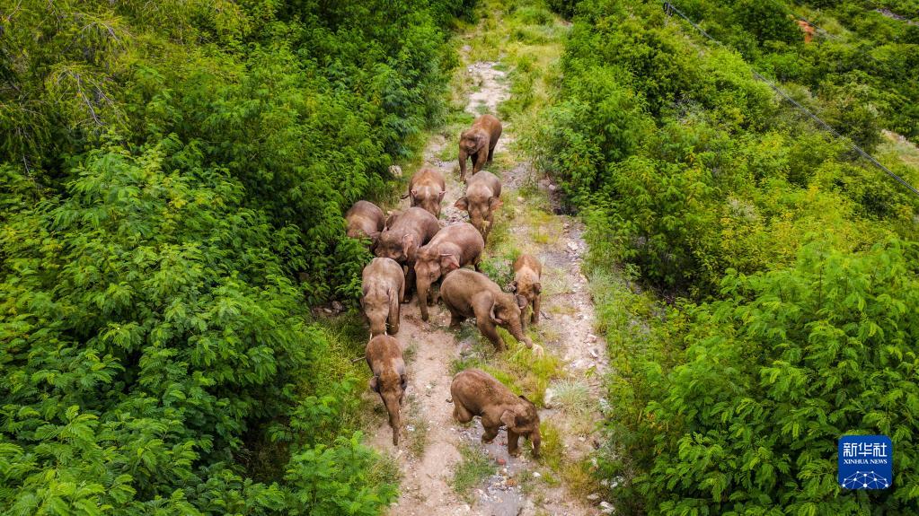 這是8月9日在云南省玉溪市元江縣境內(nèi)拍攝的象群(無人機(jī)照片)。新華社記者 胡超 攝