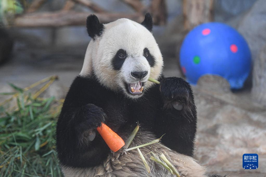 在位于海口的海南熱帶野生動植物園,大熊貓“舜舜”在享用美食(6月14日攝)。新華社記者 蒲曉旭 攝
