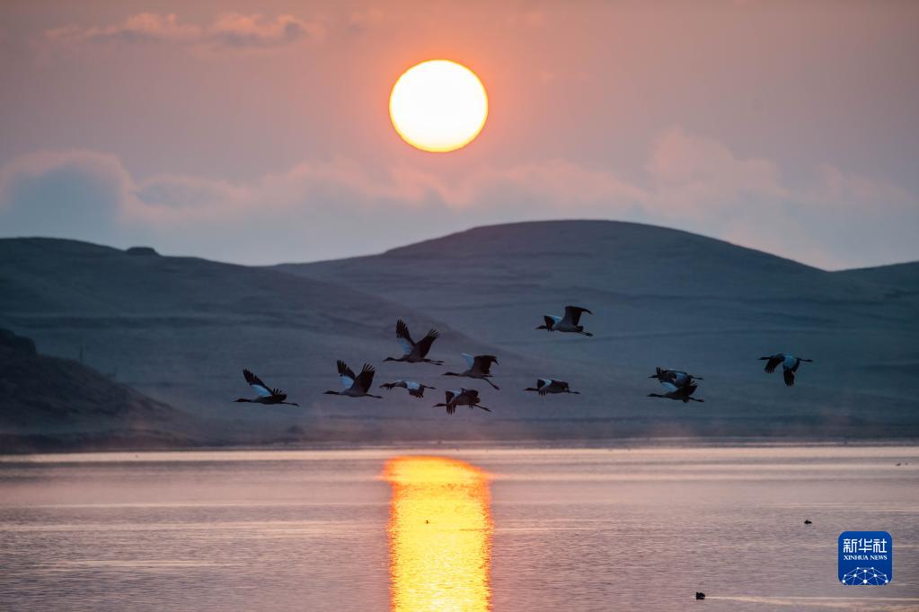 日出時分,黑頸鶴在云南省昭通市大山包黑頸鶴國家級自然保護(hù)區(qū)飛翔(2月25日攝)。新華社記者 胡超 攝