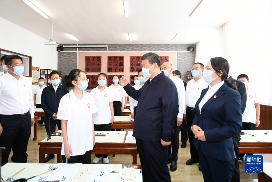 9月13日至14日,中共中央總書記、國家主席、中央軍委主席習近平在陜西省榆林市考察。這是14日上午,習近平在綏德實驗中學考察時,同正在練習書法的學生親切交流。新華社記者 李學仁 攝