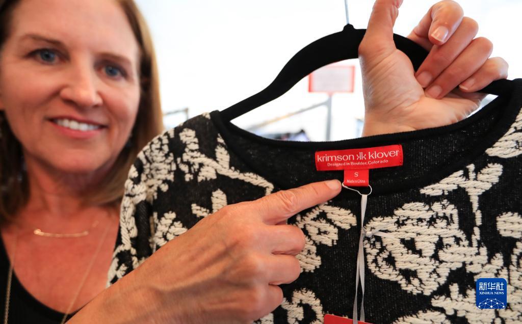 2019年9月12日,在美國科羅拉多州博爾德,克里姆森-克洛弗公司創(chuàng)始人兼首席執(zhí)行官朗達·斯溫森展示中國制造的衣服的標(biāo)簽。新華社記者 李穎 攝