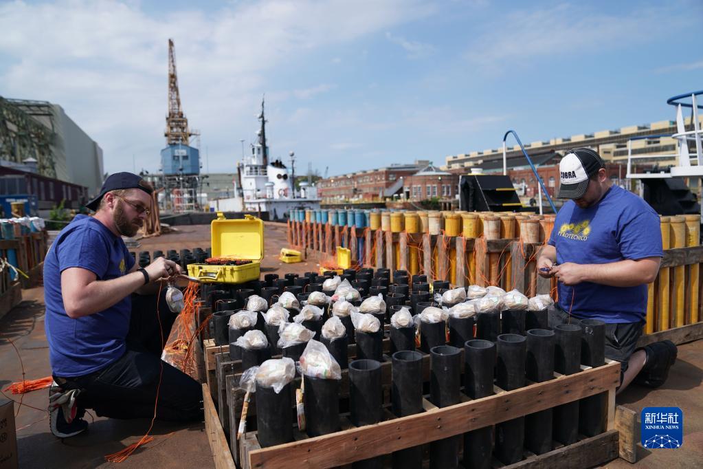 2019年5月25日,工作人員在美國賓夕法尼亞州費城一處碼頭安裝產(chǎn)自中國湖南瀏陽的煙花,為當(dāng)晚美國陣亡將士紀(jì)念日的煙花表演做準(zhǔn)備。新華社記者 劉杰 攝