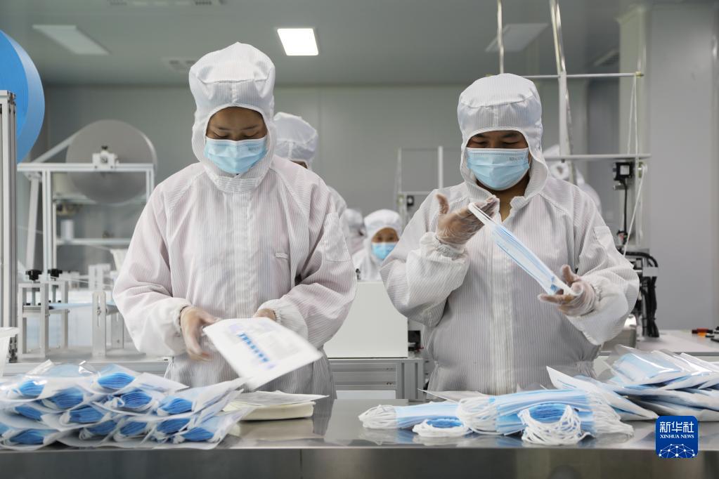 3月26日,在甘肅省臨夏市南龍鎮(zhèn)馬家莊村的甘肅陽光智家網(wǎng)絡(luò)科技有限公司醫(yī)用口罩生產(chǎn)車間內(nèi),工作人員在加工生產(chǎn)醫(yī)用口罩。2021年初,該公司與另外一家材料科技企業(yè)聯(lián)合研發(fā)的石墨烯口罩實現(xiàn)批量生產(chǎn)。新華社記者 馬莎 攝