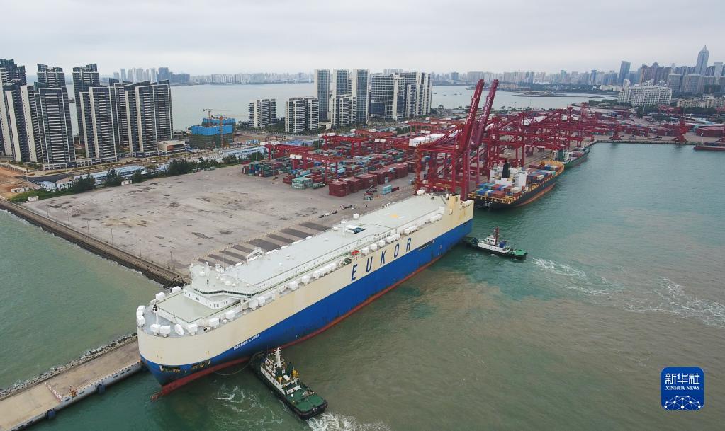 2020年2月16日,滾裝貨船“勞拉”輪駛?cè)牒?谛阌⒏郏o人機照片)。這是海南自貿(mào)區(qū)政策實施后的首艘汽車外貿(mào)船。新華社記者 楊冠宇 攝