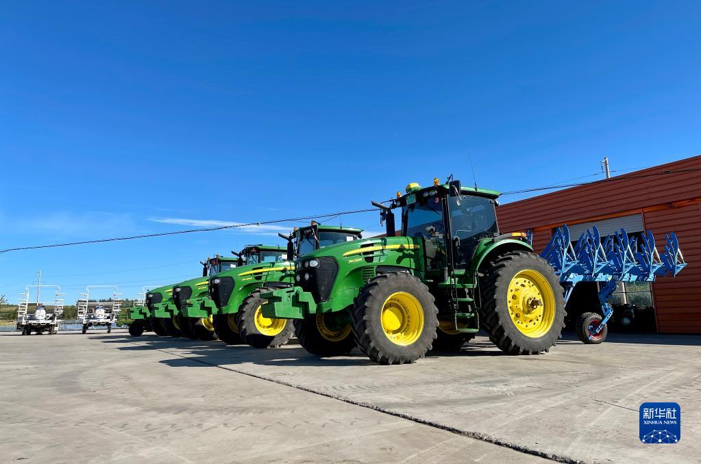 在黑龍江省北安市革命現(xiàn)代農(nóng)機專業(yè)合作社,現(xiàn)代化農(nóng)機整齊排放(9月18日攝)。新華社記者 楊思琪 攝