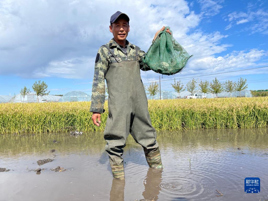 黑龍江省北安市城郊鄉(xiāng)革命村村民李學軍展示從稻田里捕撈的河蟹(9月17日攝)。新華社記者 楊思琪 攝