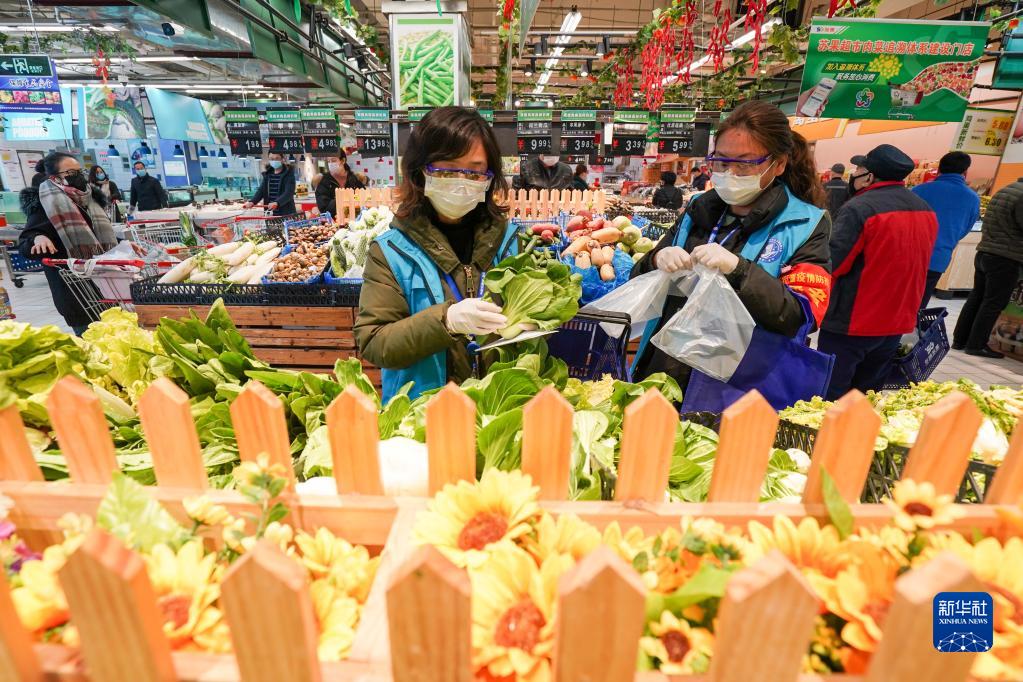 南京市建鄴區(qū)南苑街道興達(dá)社區(qū)的網(wǎng)格長(zhǎng)范璐(左)和同事在超市為轄區(qū)內(nèi)居民代購(gòu)蔬菜(2020年2月17日攝)。新華社記者 李博 攝