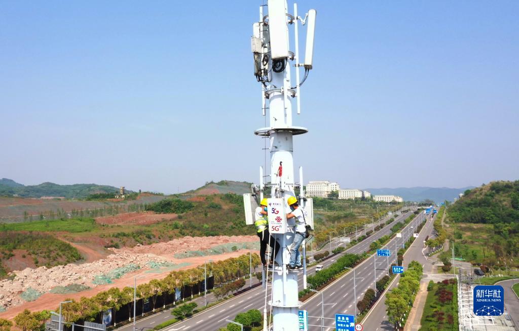工作人員在位于重慶高新區(qū)高新大道的5G基站建設(shè)現(xiàn)場(chǎng)作業(yè)(2020年4月15日攝,無(wú)人機(jī)照片)。新華社記者 王全超 攝