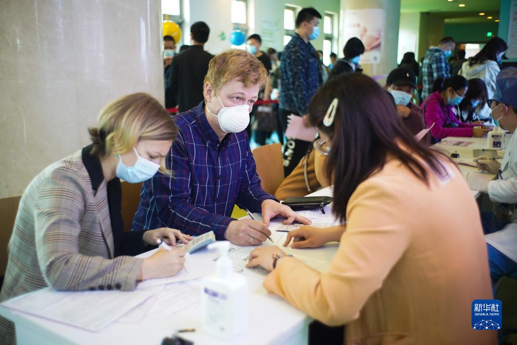 4月15日,在位于北京經(jīng)濟(jì)開(kāi)發(fā)區(qū)的一處新冠疫苗接種點(diǎn),外籍人士接種新冠疫苗前填寫(xiě)個(gè)人信息。新華社記者 彭子洋 攝