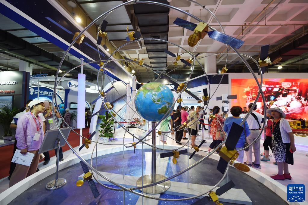 參觀者在第二十屆中國(guó)北京國(guó)際科技產(chǎn)業(yè)博覽會(huì)上參觀展出的北斗衛(wèi)星導(dǎo)航系統(tǒng)模型(2017年6月9日攝)。新華社記者 鞠煥宗 攝