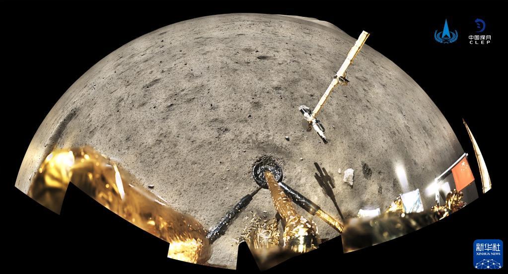 2020年12月4日,國(guó)家航天局公布了探月工程嫦娥五號(hào)探測(cè)器在月球表面國(guó)旗展示的照片。嫦娥五號(hào)著陸器和上升器組合體全景相機(jī)環(huán)拍成像,五星紅旗在月面成功展開,此外圖像上方可見(jiàn)已完成表取采樣的機(jī)械臂及采樣器。新華社發(fā)(國(guó)家航天局供圖)