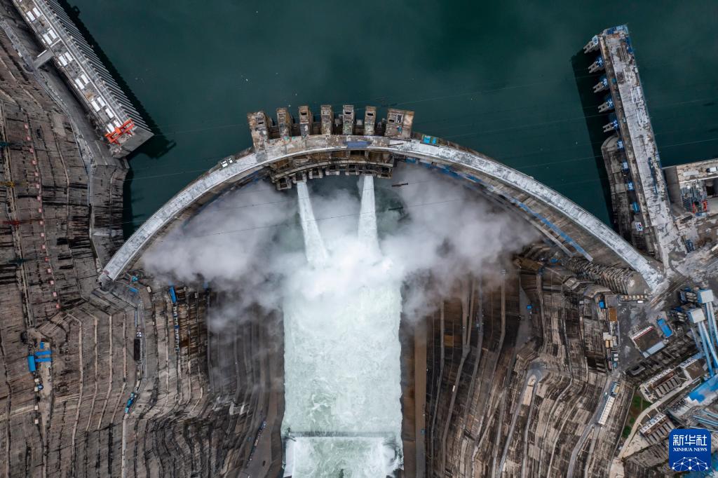俯瞰白鶴灘水電站(無(wú)人機(jī)照片,6月28日攝)。金沙江白鶴灘水電站首批機(jī)組于6月28日安全準(zhǔn)點(diǎn)投產(chǎn)發(fā)電。新華社記者 江文耀 攝