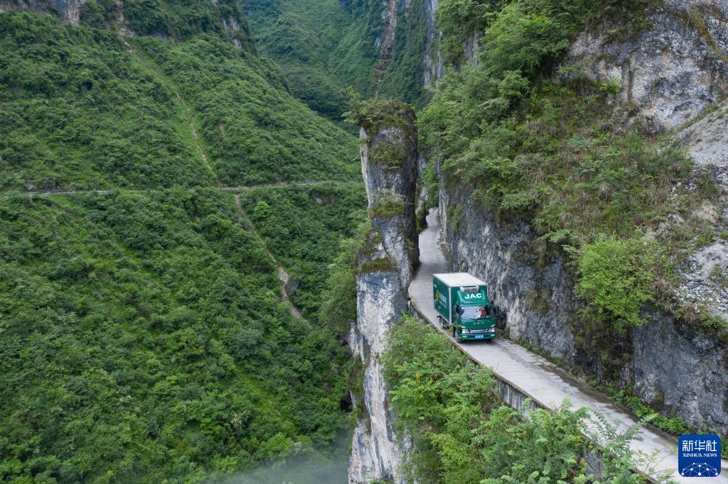 郵車行進(jìn)在通往四川省漢源縣永利鄉(xiāng)古路村的山路上(6月23日攝,無(wú)人機(jī)照片)。新華社記者 江宏景 攝