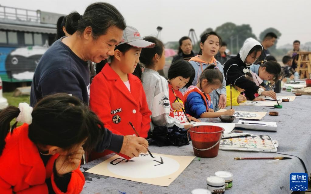 10月31日,許國(guó)良(左二)在湖南省益陽(yáng)市資陽(yáng)區(qū)張家塞鄉(xiāng)富民村為當(dāng)?shù)亓羰貎和厦佬g(shù)課。新華社發(fā)(孫國(guó)基攝)