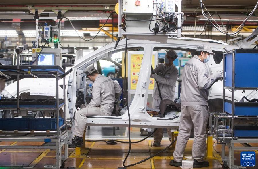 2020年3月24日,工人在湖北武漢東風乘用車公司工廠總裝車間的流水線上作業(yè)。2020年3月下旬左右,武漢各企業(yè)開始陸續(xù)復工復產。新華社記者 肖藝九 攝