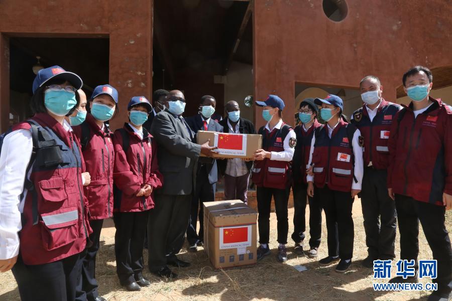 5 月 19 日,在津巴布韋中馬紹納蘭省的姆武爾維醫(yī)院,中國抗疫醫(yī)療專家組為當?shù)蒯t(yī)療機構(gòu)捐贈醫(yī)療物資。新華社記者 張玉亮 攝