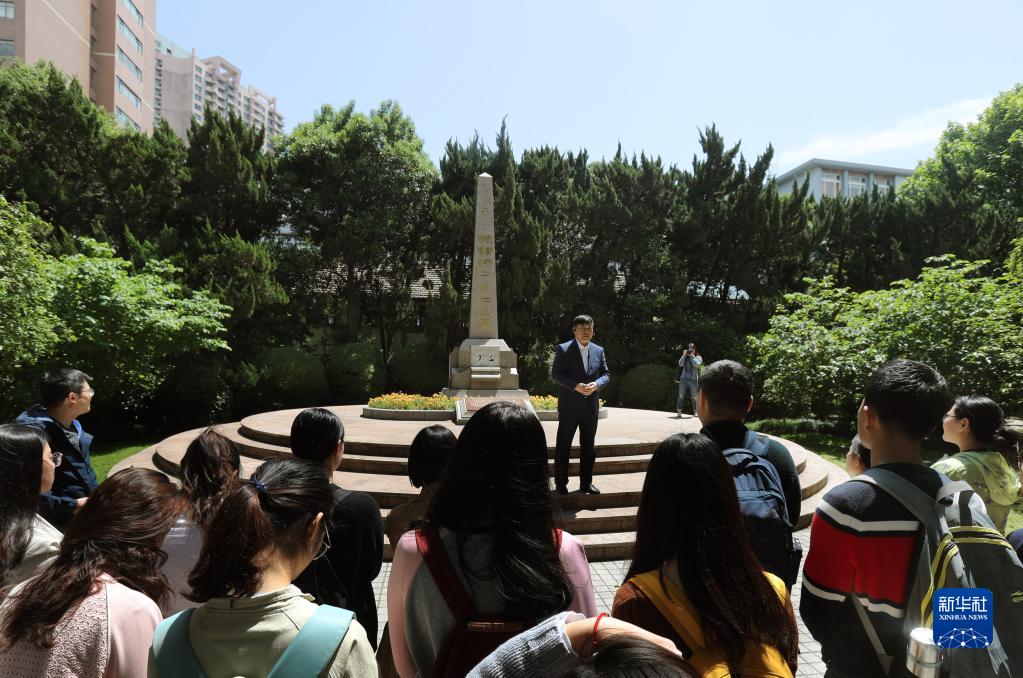 在上海交通大學(xué)校園里的史霄雯、穆漢祥烈士墓前,劉統(tǒng)教授在講述兩位烈士犧牲的歷史經(jīng)過(2019年5月7日攝)。新華社記者劉穎攝