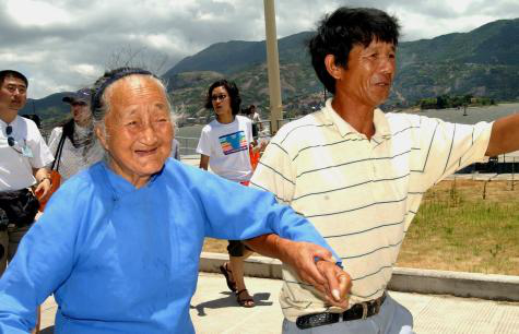 2003年7月22日,在馬祖探親的福建省連江縣83歲的張水金老人(左)和兒子(右)乘坐“閩珠二號(hào)”海上直航客輪回到福州馬尾。新華社記者 張國俊 攝