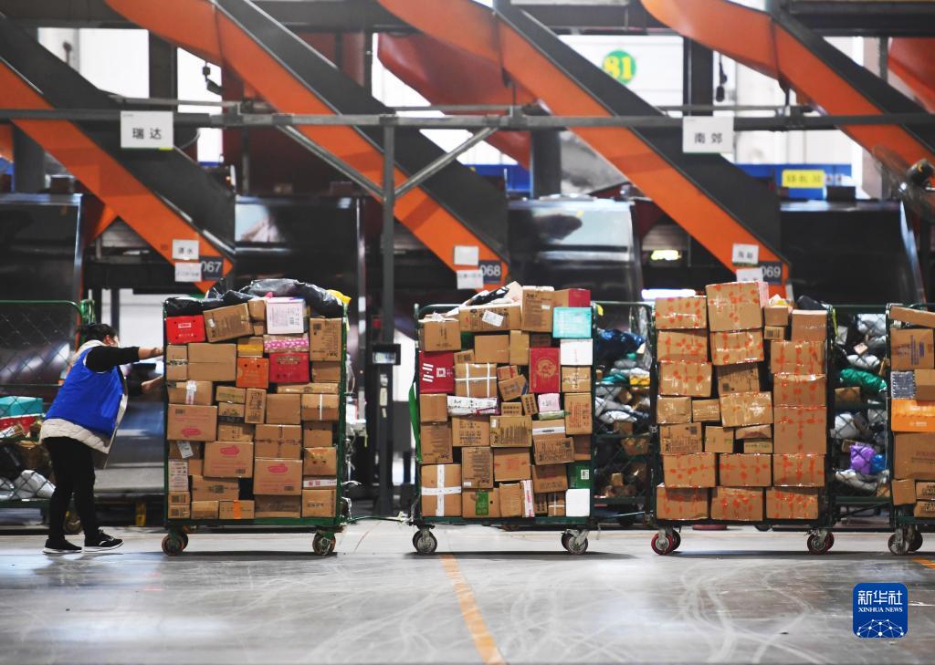 在中國郵政集團(tuán)有限公司河南省鄭州郵區(qū)中心,工作人員在轉(zhuǎn)移快遞包裹(11月11日攝)。新華社記者 張浩然 攝