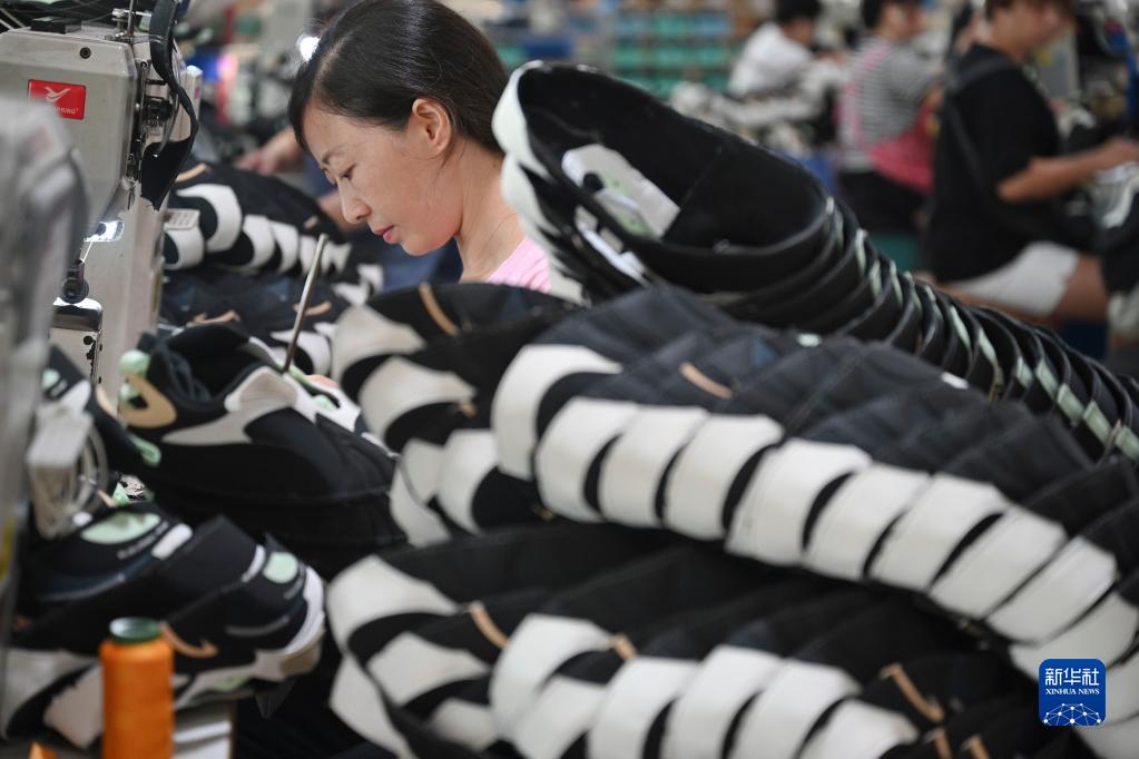 在位于福建省泉州市的鴻星爾克集團(tuán)鴻榮輕工公司車間,工人在制鞋生產(chǎn)線上作業(yè)(7月30日攝)。泉州市是我國重要的制造業(yè)基地,民營企業(yè)較多。新華社記者 宋為偉 攝