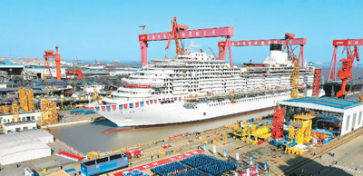 日前,中國首制大型郵輪在中國船舶集團旗下上海外高橋造船有限公司船塢內順利實現(xiàn)塢內起浮。這是大型郵輪建造的重要節(jié)點,標志著該項目向著完工交付的總目標邁出關鍵一步。去年末,中國船舶集團總部由北京遷往上海。本報記者 沈文敏攝