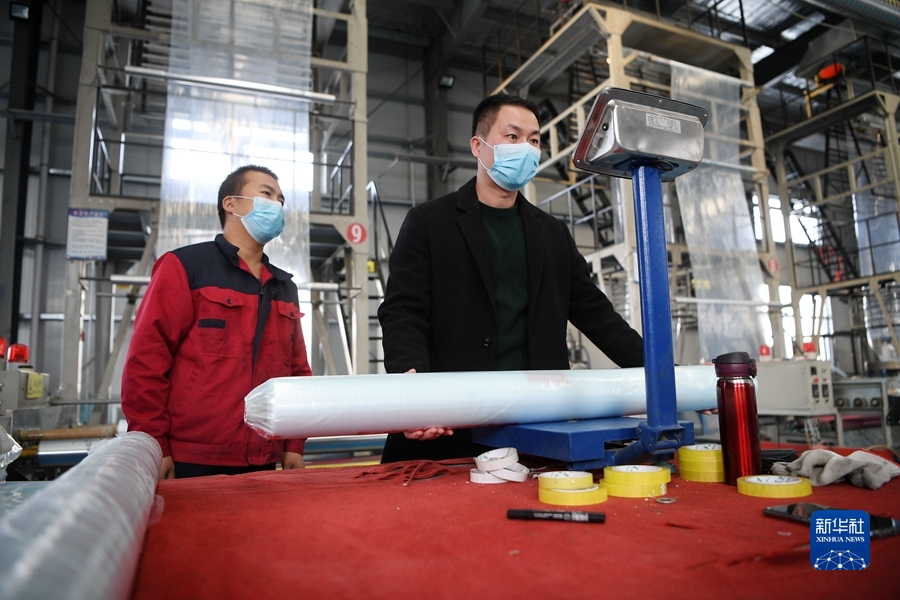 2022年1月28日,閩商鄭開煌(右)在位于寧夏隆德縣閩寧扶貧產(chǎn)業(yè)園的農(nóng)用薄膜生產(chǎn)線查看產(chǎn)品質(zhì)量。新華社記者 王鵬 攝