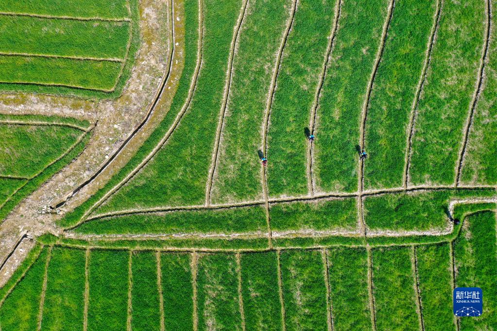 3月9日,浙江省寧波市鄞州區(qū)東吳鎮(zhèn)天童村村民在田間管護農(nóng)作物(無人機照片)。新華社發(fā)(胡學軍 攝)