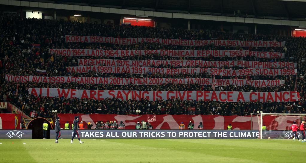 3月17日,在塞爾維亞首都貝爾格萊德舉行的一場(chǎng)足球比賽中,塞爾維亞觀眾拉起多條橫幅,細(xì)數(shù)美國(guó)、北約過(guò)去幾十年來(lái)轟炸或挑起戰(zhàn)爭(zhēng)的國(guó)家和地區(qū)名單,并高唱反戰(zhàn)歌曲,以此諷刺西方在“反戰(zhàn)”方面的雙重標(biāo)準(zhǔn)。(新華社發(fā),普雷德拉格·米洛薩夫列維奇攝)