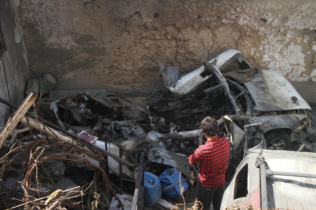 2021年9月2日,阿富汗喀布爾一處被美軍空襲過(guò)的居民區(qū)的居民站在汽車殘骸旁。(新華社發(fā),塞夫拉赫曼·薩菲攝)