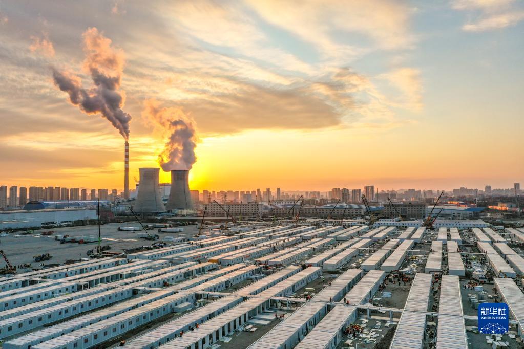 這是3月20日傍晚拍攝的吉林市高新南區(qū)隔離方艙建設現場(無人機照片)。新華社記者 張楠 攝
