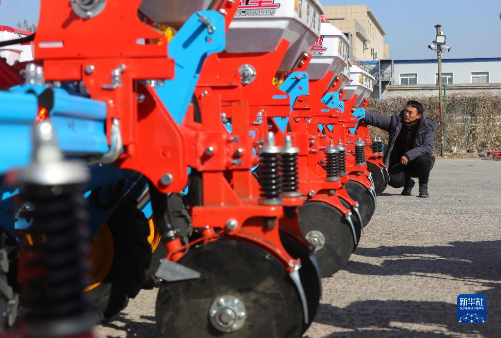 2月23日,在遼寧省鐵嶺縣遼寧實豐機械有限公司,工人檢查即將出廠的玉米播種機。新華社記者 楊青 攝