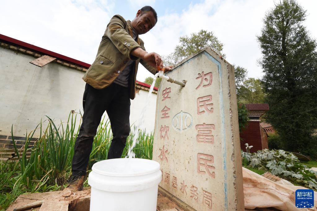 甘肅省定西市渭源縣元古堆村村民在自來(lái)水龍頭前接水(2019年9月3日攝)。新華社記者 范培珅 攝