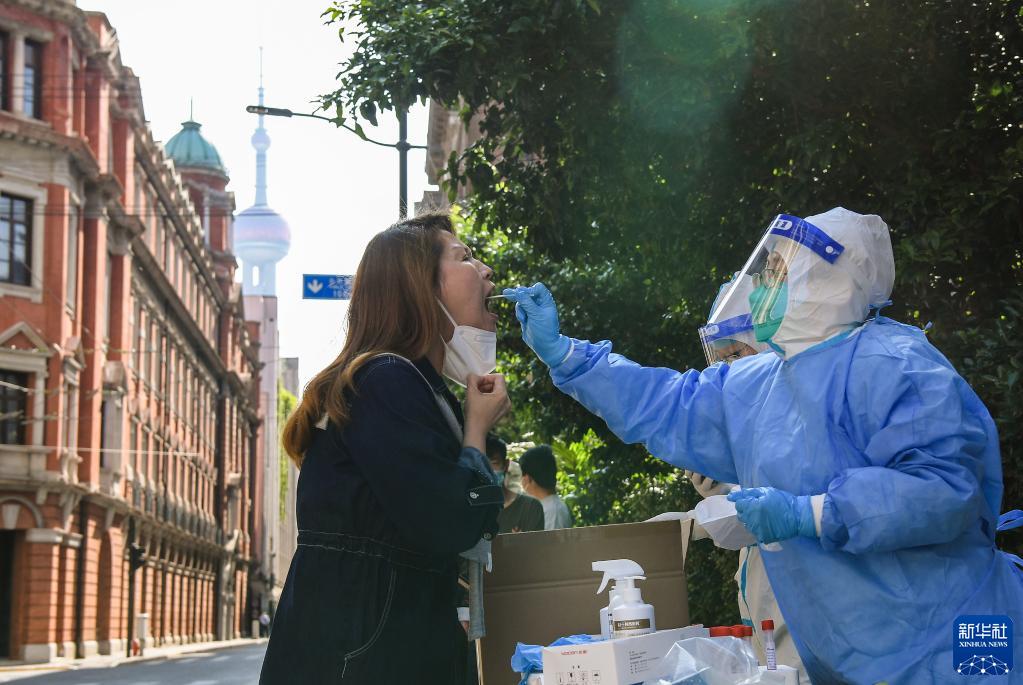 居民在上海市黃浦區(qū)核酸篩查點(diǎn)接受采樣(5月7日攝)。新華社記者 李賀 攝