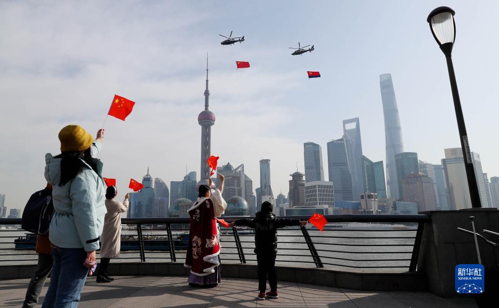 兩架懸掛國旗和警旗的警航直升機(jī)飛過上海外灘,慶祝首個“中國人民警察節(jié)”(2021年1月10日攝)。新華社記者 方喆 攝