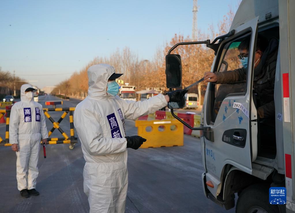 石家莊市公安局高新技術(shù)產(chǎn)業(yè)開發(fā)區(qū)公安分局民警在藁城區(qū)通往市區(qū)的路口執(zhí)勤(2021年1月10日攝)。當(dāng)日是首個“中國人民警察節(jié)”。新華社記者 楊世堯 攝