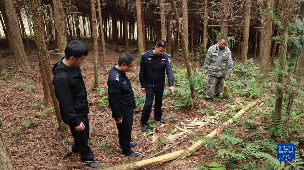 福建省南平市浦城縣公安局石陂森林派出所所長郭曉強(qiáng)(右二)在盜伐林木案件現(xiàn)場分析作案動機(jī)(2020年12月11日攝)。新華社記者 趙雪彤 攝