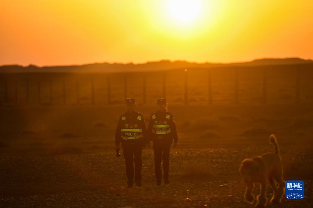 內(nèi)蒙古阿拉善邊境管理支隊(duì)銀根邊境派出所戍邊夫妻警務(wù)室的徐乃超和李文娜在邊境線附近巡邏(2022年4月18日攝)。新華社記者 彭源 攝