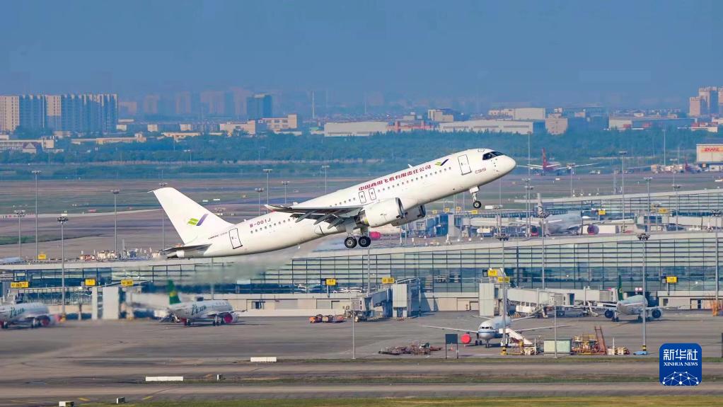 2022年5月14日6時52分,編號為B-001J的C919大飛機從上海浦東機場第4跑道起飛,于9時54分安全降落,標(biāo)志著中國商飛公司即將交付首家用戶的首架C919大飛機首次飛行試驗圓滿完成。新華社發(fā)